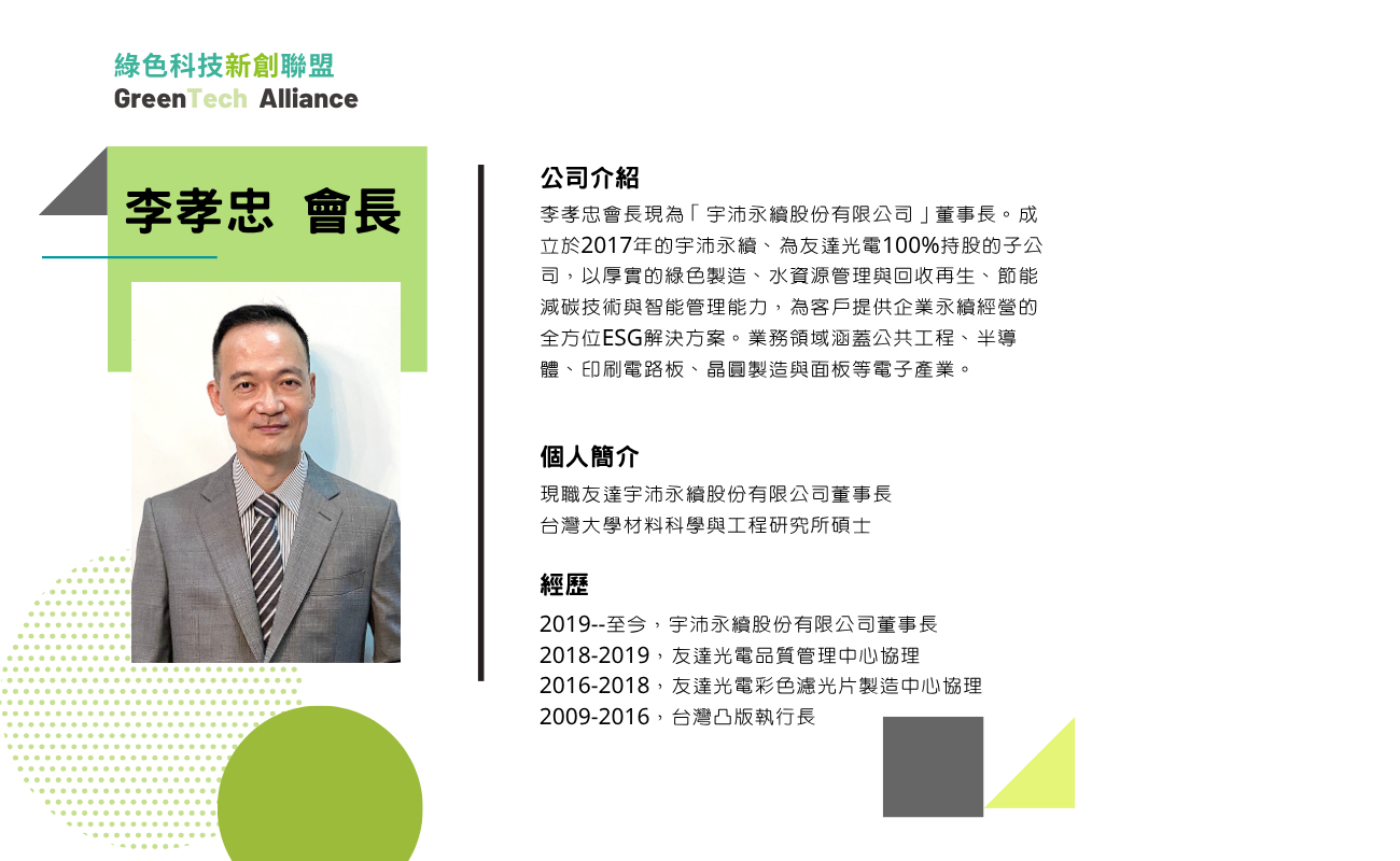 首屆會長由友達宇沛永續科技股份有限公司 李孝忠董事長擔任。